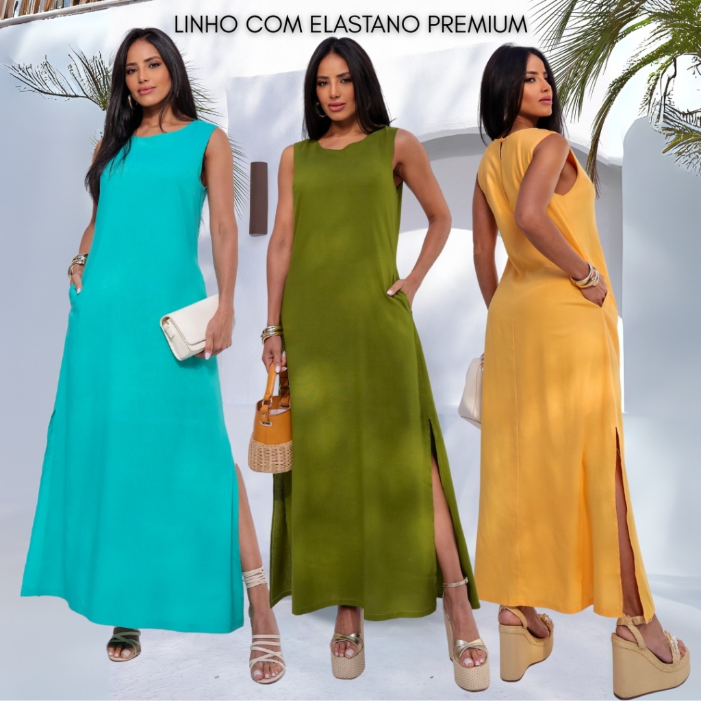 Vestido Feminino Longo em Linho Premium ✅ DESTAQUES DO VESTIDO LONGO EM LINHO PREMIUM: Da passadoria para sua casa!** ✅ Material**: Linho com Elastano Premium + Forro - Material resistente com 2% de Elastano ✅ Pinças no busto e nas costas**: Caimento único e sofisticado. Zero transparência + forro**: Conforto e segurança em qualquer ocasião. Fresco e perfeito para o verão**: Leveza e frescor o dia todo. Fenda elegante**: Um toque de sofisticação no caimento. COMPOSIÇÃO DO VESTIDO LONGO EM LINHO PREMIUM: 51% Viscose – Leve e macia. 47% Linho – Fresco e sofisticado. 2% Elastano – Conforto e flexibilidade. Prazo de envio: Após confirmação de pagamento, enviamos seu pedido em até 24 horas! 🚚 📏 Guia de Medidas P -- Busto 86 | Cintura 81 | Quadril 107 | Comp. 130 cm M – Busto 108 | Cintura 84 | Quadril 111 | Comp. 143 cm G – Busto 97 | Cintura 90 | Quadril 117 | Comp. 134 cm GG – Busto 101 | Cintura 95 | Quadril 117 | Comp. 135 cm 🔹 Garantia de 7 dias! 🔹 Comprou e precisa trocar? Fique tranquila! Garantimos a troca em até 7 dias para sua total satisfação. 💖🛍️ 💬 **Dúvidas sobre o VESTIDO LONGO EM LINHO PREMIUM? Fale com a gente pelo chat. Será um prazer te atender! 💖