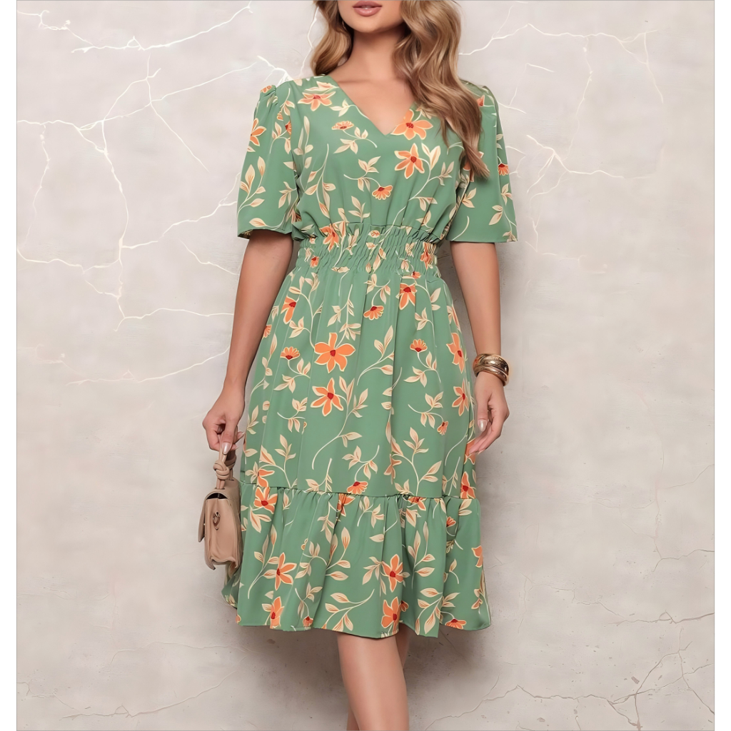 Vestido Feminino / Folha /liso de crepinho /Ombro à Ombro /elastec