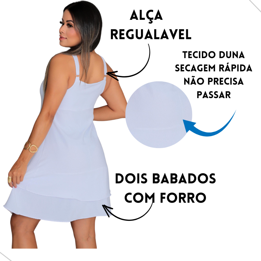 VESTIDO FEMININO FORRADO COM DOIS BABADOS ALÇA LARGA COM REGULADORES PARA AJUSTAR TECIDO DUNA
