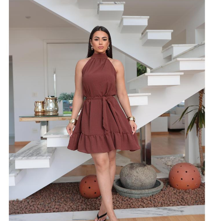 Vestido Feminino Gola Halter Amarração No Pescoço com babado na parte de baixo Tendência Chic Elegante