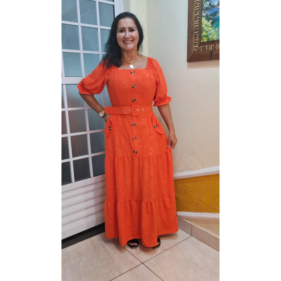 Vestido Longo com Mangas Bufantes e Cinto – Charme que Encanta em Cada Detalhe Descubra o poder de um look que une elegância vibrante, conforto impecável e um toque de romantismo moderno. Esse vestido longo em tom coral intenso é a escolha perfeita para quem quer se destacar com leveza e sofisticação em qualquer ocasião. ✨ Destaques que fazem a diferença: • Mangas bufantes 3/4 com elástico, que trazem um ar romântico e valorizam os ombros • Gola quadrada, que alonga o pescoço e valoriza o colo com delicadeza • Cintura marcada com cinto do próprio tecido – define a silhueta com charme e conforto • Botões frontais decorativos, que dão um toque clássico e elegante • Saia em camadas com babado, criando um caimento leve, fluido e cheio de movimento • Tecido com leve textura floral, que adiciona um detalhe sutil e encantador • Bolsinhos frontais com aba, funcionais e estilosos 📏 Veste com conforto tamanhos do 44 ao 50, com caimento ajustável e modelagem pensada para valorizar diversos biotipos. Medidas aproximadas: • Busto: 110 cm até 125 cm (acomoda bem vários biotipos) cintura ate 108 quadril ate 135 • Comprimento: 1,45m • Veste tamanho único do 44 ao 50 com caimento ajustável graças ao elastano e ao corte inteligente