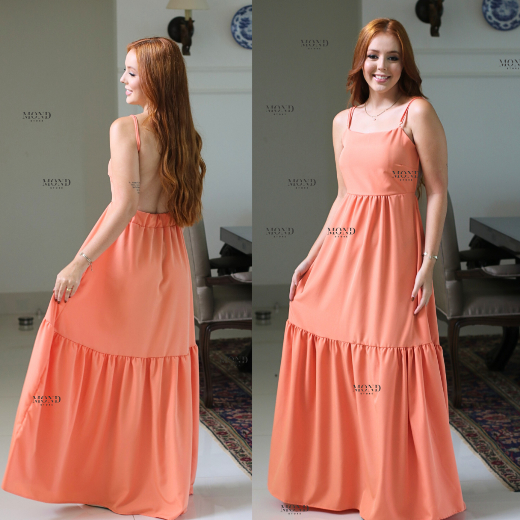 Vestido Feminino Longo Decote Costas Nuas com Bojo e Alças Regulaveis Soltinho Longo 1 Maria