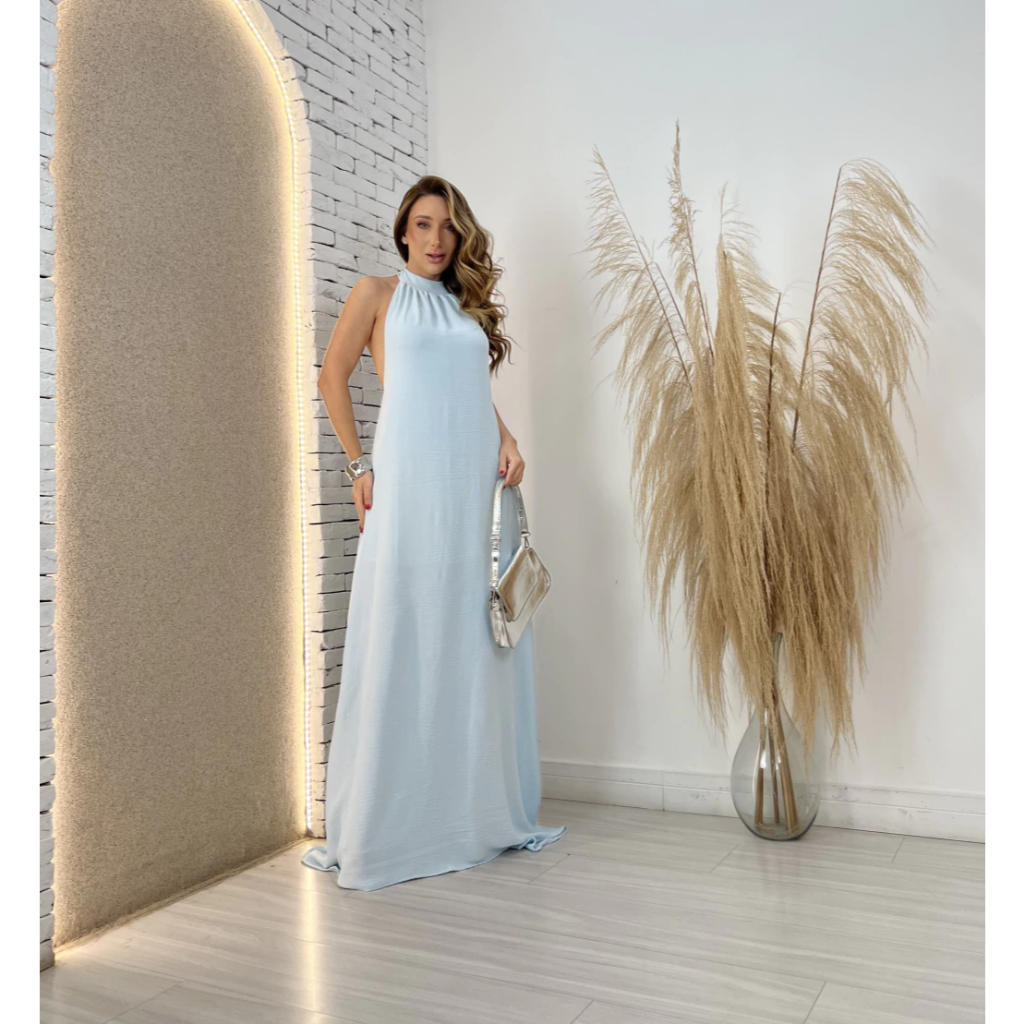 Vestido Feminino Longo Gola Alta Frente Única Costa Nua – Elegante Especial Fim de Ano ✨