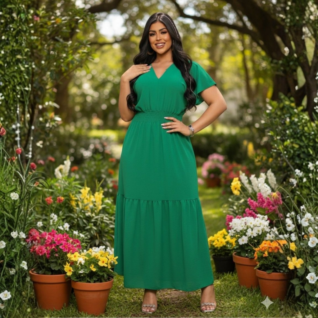 NÃO PERCA TEMPO E GARANTA AGORA O SEU VESTIDO ELEGANTE E SUPER VERSATIL !!!! Elegância e Conforto: Vestido Longo Evangélico Babado Gola V com Lastex Prepare-se para se apaixonar pelo Vestido Longo Evangélico que une a sofisticação da moda modesta com o máximo de conforto. Perfeito para diversas ocasiões, desde o culto, eventos especiais, reuniões, até um passeio elegante. Características que Encantam: * Design Sofisticado: Apresenta uma gola V que alonga a silhueta de forma discreta e elegante, realçando o colo com modéstia. * Detalhe em Babado: A saia, muitas vezes em camadas ou com babado (três marias), oferece um caimento leve, fluido e romântico, garantindo movimento e feminilidade a cada passo. * Conforto Incomparável (Lastex): A região da cintura e/ou punhos possui um acabamento em lastex (smok), que se ajusta perfeitamente ao seu corpo, proporcionando uma modelagem confortável e versátil, sem apertar, e valorizando sua cintura com naturalidade. * Tecido Premium: Confeccionado em um tecido de toque macio e excelente caimento (como Viscose, Crepe de Malha, ou Duna), garantindo conforto térmico e zero transparência (quando for forrado ou no caso de tecido encorpado). * Comprimento Longo: O comprimento clássico confere a elegância e a discrição exigidas pela moda evangélica. * Versatilidade: Fácil de combinar com sandálias, saltos ou sapatilhas. Adicione um cinto para um visual ainda mais acinturado! Dúvidas Frequentes: 1- Qual o tecido? Poliéster, superconfortável e leve. 2- A peça é fiel ao anúncio? Sim, o produto é idêntico às fotos e descrições, não perde a cor. 3- A forma é pequena? Orientamos que se escolha o seu tamanho ideal, nossa tabela de medida é baseada em sua peça de calça jeans sem elastano 4- Qual o prazo de entrega? O envio é feito em até 24 horas úteis após a confirmação do pagamento. Antes de finalizar a compra, consulte o Guia de Tamanhos nas fotos do anúncio para escolher o tamanho ideal. Verifique seu endereço de entrega, pois não será possível alterá-lo após a confirmação da compra. Utilize o campo de perguntas para esclarecer quaisquer dúvidas antes de realizar o pedido.