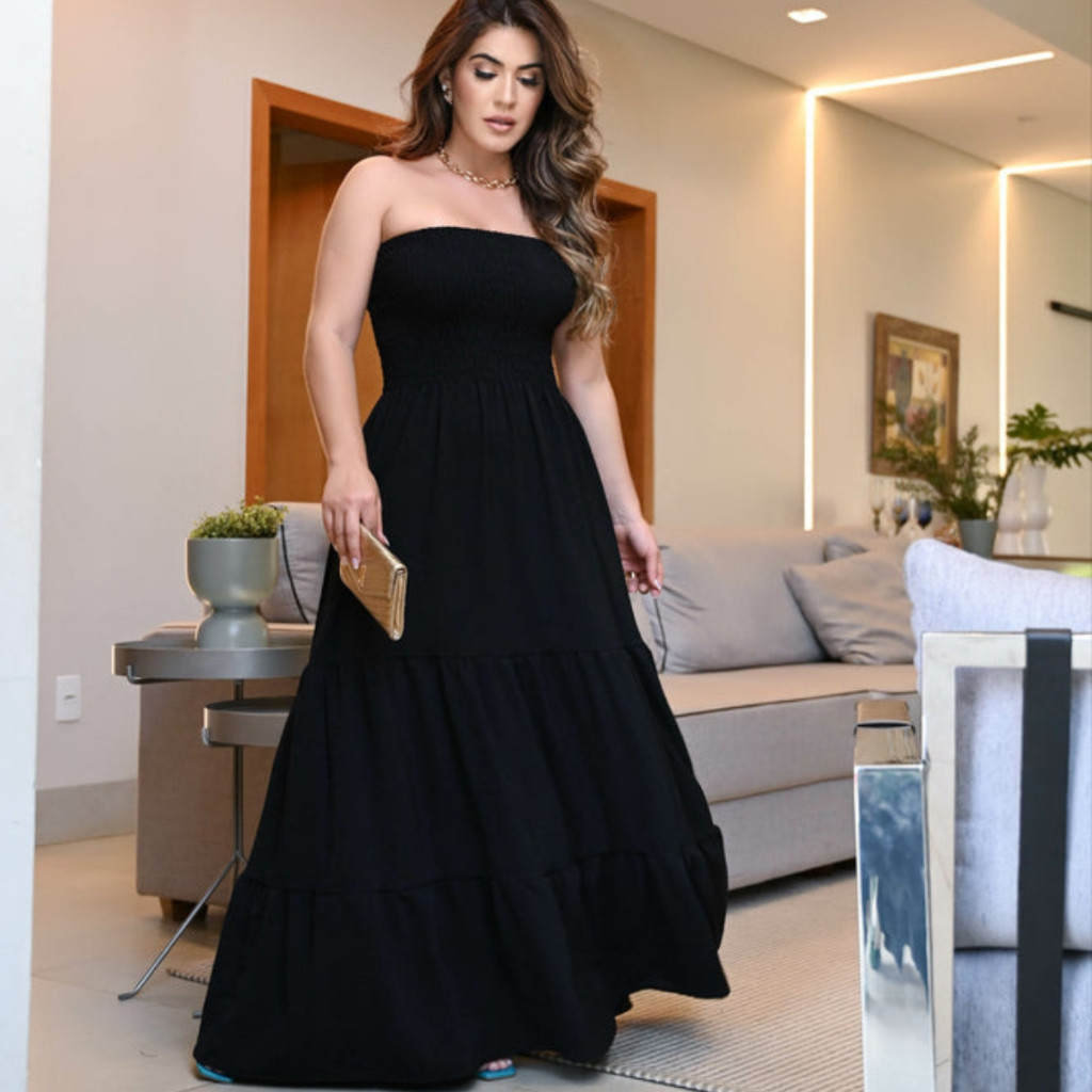 Vestido Longo Lastex Vestido longo com lastex, região do busto feito em lastex e com bastante elasticidade. Um vestido confortável e tem a modelagem linda no corpo. Modelo veste: Vestido tamanho único, possui lastex e estica bastante servindo tranquilamente do 36 até o tamanho 44. Confira nossas medidas abaixo para que faça uma compra tranquila. Medidas da peça: * Comprimento do vestido: 125cm * Comprimento da parte com lastex: 23cm Como usar: A peça combina muito bem com um tênis, rasteirinha ou até um salto. Aposte em acessórios que valorize ainda mais a peça! Composição detalhada da peça: * Vestido longo * Tecido crepe dunas * Corpo em lastex * Sem Mangas * Vestido estampado *Não encolhe e não amarrota Veste do 36 ao 44.