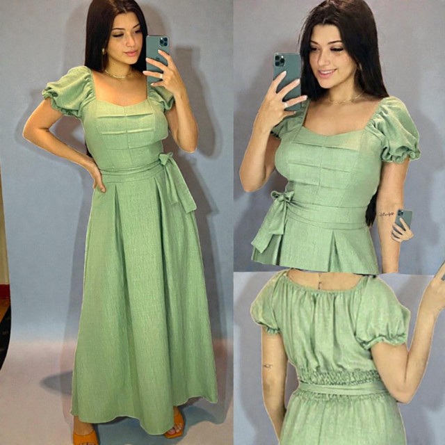 VESTIDO FEMININO LONGO PRINCESA MANGAS E CINTO NO DUNA LINHO MODA CASUAL ELEGANTE LUXO FESTA