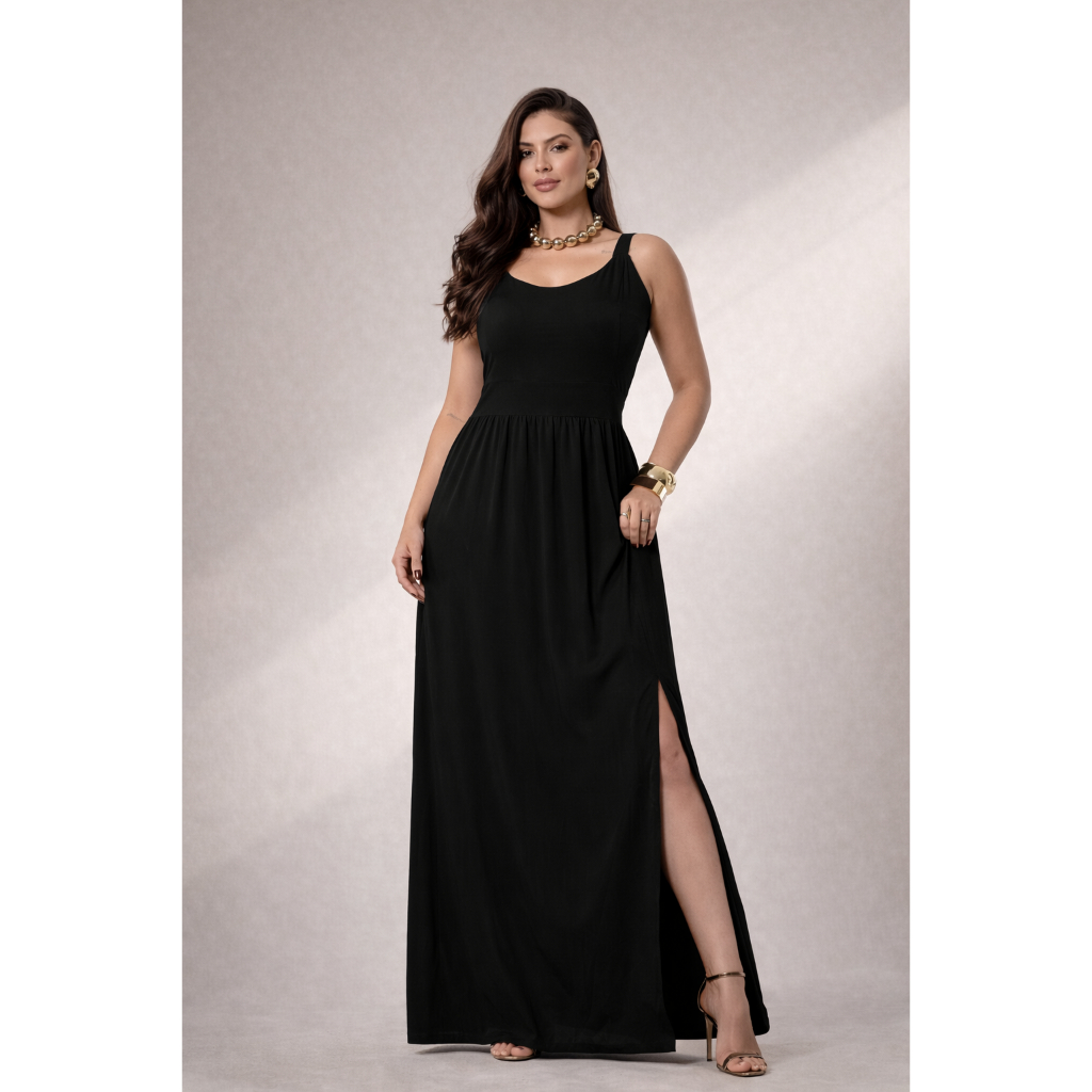 Vestido Feminino Longo Viscolinho Liso com Fenda Casual Elegante Verão
