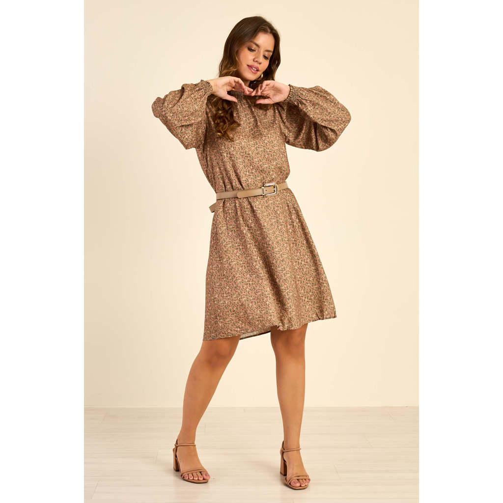 Vestido Feminino Manga Longa Floral Marialícia Marrom