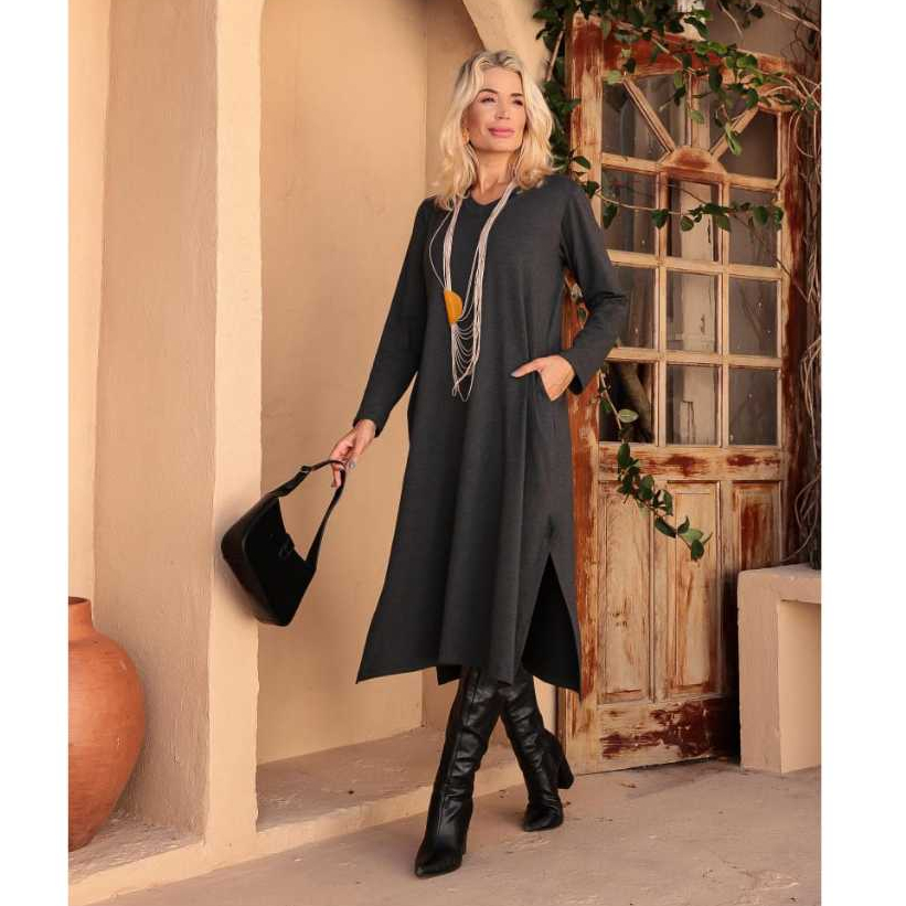 Vestido Feminino Manga Longa Midi Elegante Confortável com Bolso Saruel