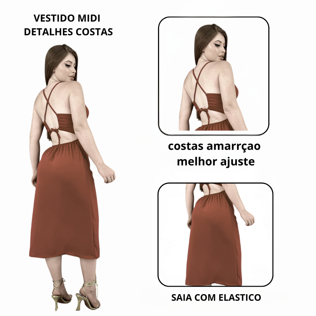 Vestido Feminino Midi Curto Fenda Lateral Alça Fina Amarração Costas Elegante Festa Casamento