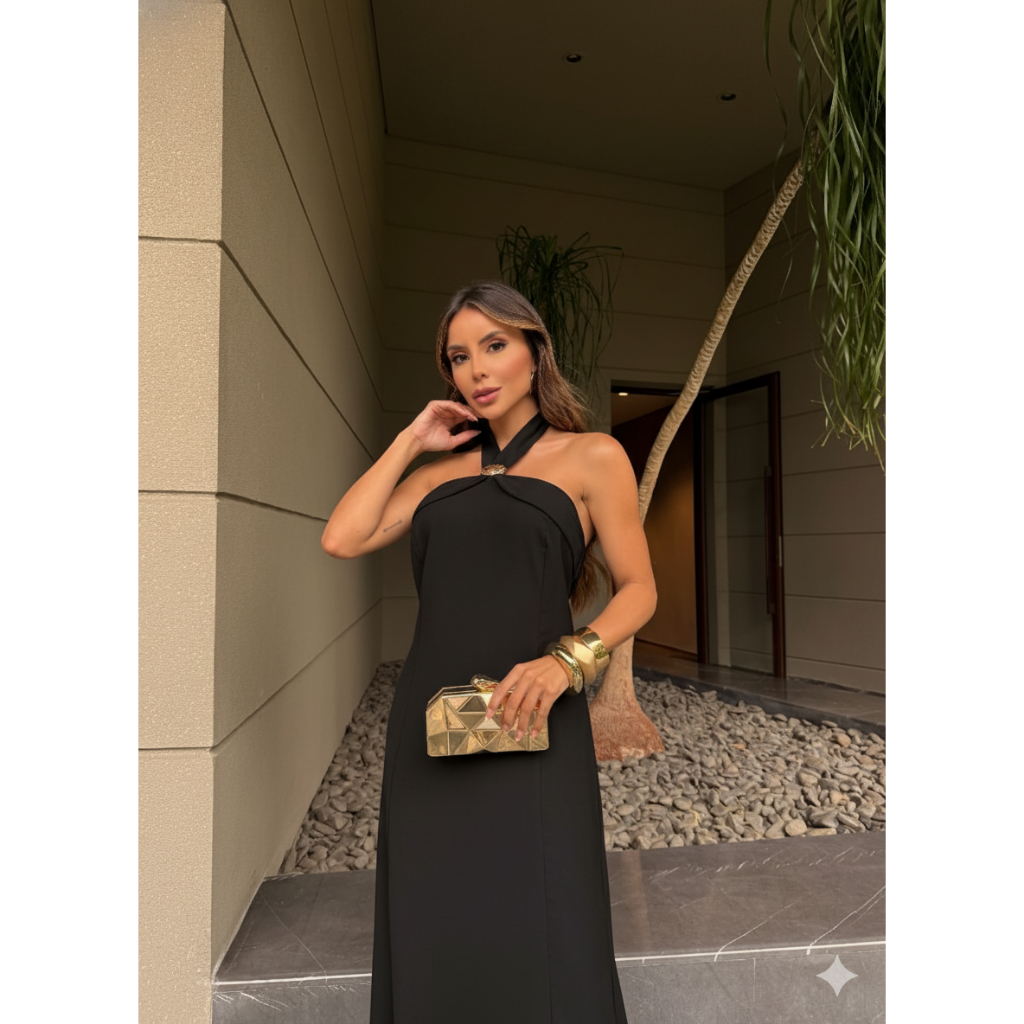 Encante-se com a sofisticação minimalista do Vestido Midi Halter Azul Celeste. Com modelagem reta e caimento leve, a peça traz um toque moderno e refinado, ideal para ocasiões especiais. O decote halter cruzado valoriza os ombros e o colo, enquanto o detalhe dourado na gola acrescenta elegância e exclusividade. Confeccionado em tecido de toque suave e brilho sutil, garante conforto e movimento ao vestir. Combine com acessórios dourados e sandálias delicadas para um visual impecável em eventos, jantares ou celebrações ao ar livre. ✨ Destaques: Modelagem midi com caimento fluido Gola halter cruzada com detalhe dourado Tecido leve e sofisticado Ideal para ocasiões elegantes