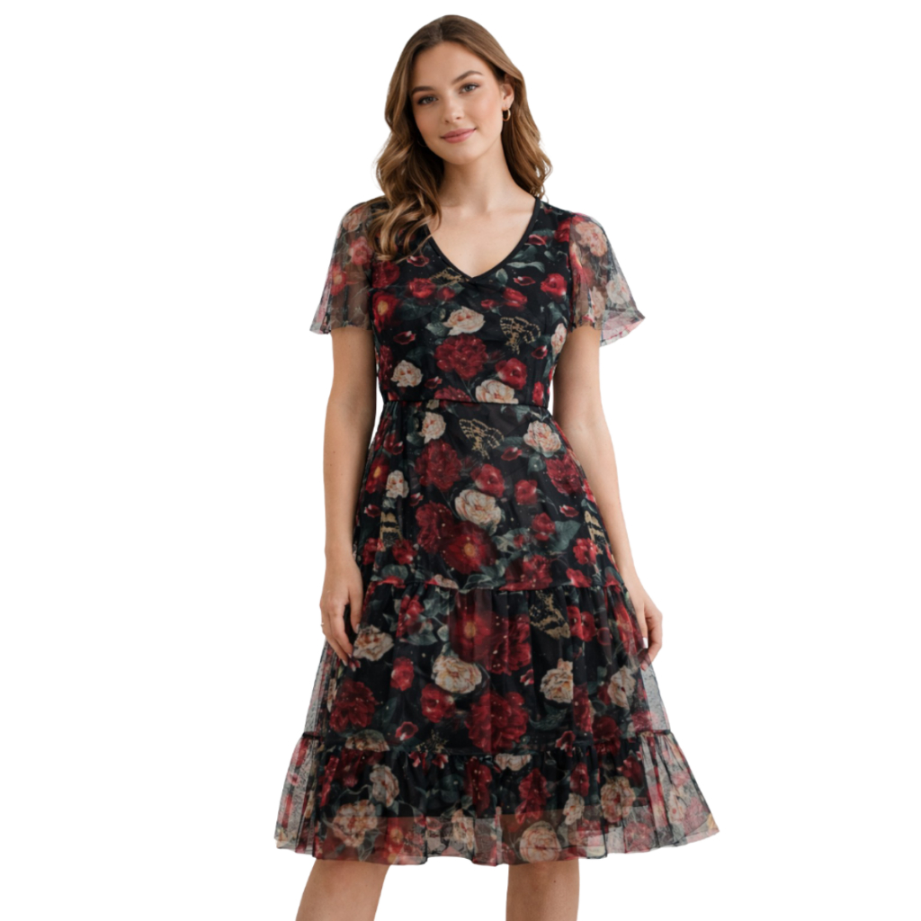 Elegante e delicado, o vestido midi em tule floral é uma peça cheia de charme e sofisticação. Com um forro suave que garante conforto e cobertura, ele apresenta um decote em V que valoriza o colo, enquanto as mangas curtas em estilo godê trazem um toque romântico e fluido. A modelagem evasê da saia, complementada por um babado sutil, cria um movimento leve e feminino, perfeito para ocasiões especiais ou para adicionar um toque refinado ao seu dia a dia. Cuidados com o Vestido Midi em Tule: Lavar com cores similares; Deixar secar na sombra; Não utilizar alvejantes.