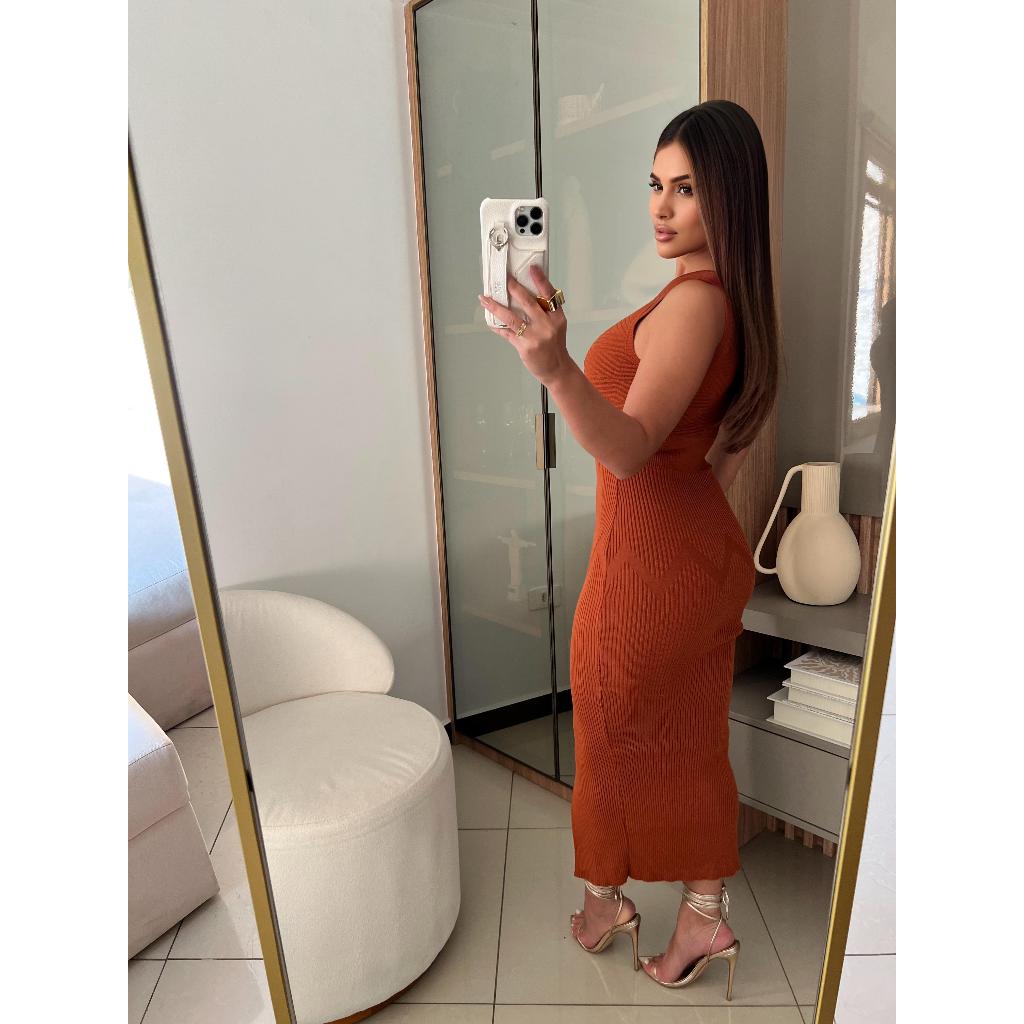 Vestido feminino Midi Fenda Frontal Alça Única Modal Tricô Canelado para Festa Confortavel