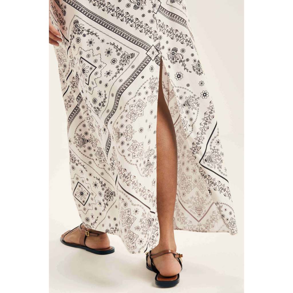 O Vestido Marialícia é sinônimo de elegância e leveza. Feito em tecido de viscose, ele possui comprimento midi longo, alças finas e modelagem reta com caimento fluído, valorizando a silhueta. A estampa inspirada na clássica bandana floral traz um toque boho chic, perfeito para dias quentes e ocasiões ao ar livre. Além disso, o detalhe com fenda na parte das costas garante um charme extra para o visual. Combine com acessórios delicados para um look moderno e cheio de personalidade.Modelo veste tamanho P. Medidas da modelo: 81cm de busto; 90cm de quadril; e 63cm de cintura.