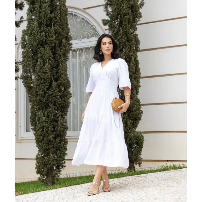 VESTIDO MIDI ,DECOTE V MODELO VERSATIL COMBINA COM QUALQUER OCASIÃO TECIDO VISCOLINHO FORRADO ELASTICO NAS COSTAS TAMANHO ÚNICO VESTE DO 38 AO 44 BUSTO 80-100 CM CINTURA 70-90 QUADRIL ATÉ 140 CM