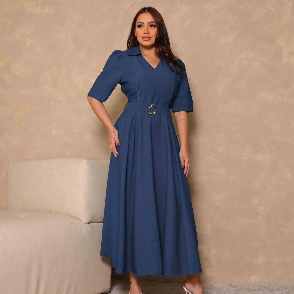 ✨ DIFERENCIAIS DO NOSSO VESTIDO: Tecido Sensorial Premium: Toque agradável na pele, encorpado e com caimento fluido. Design Sofisticado: Gola lapela com decote em V que alonga a silhueta. Cinto Incluso: Acompanha cinto encapado com fivela dourada luxo para marcar a cintura . Detalhes de Costura: Acabamento em pesponto contrastante que traz um ar de "boutique" para a peça. Manga Princesa: Comprimento elegante com leve detalhe bufante no ombro.