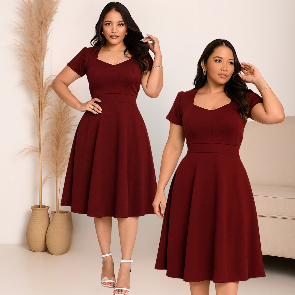 Vestido Feminino Mídi Social Rodado Manga Princesa Decote Coração Moda Evangélica Casual PluzSize