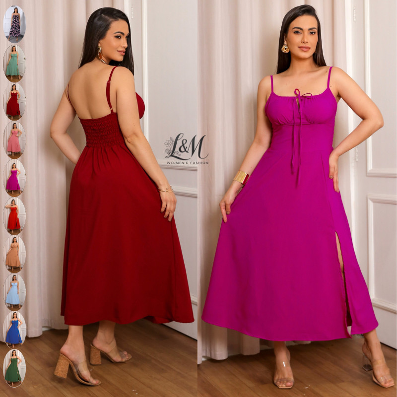Vestido Feminino Mídi Verão 🌸 Romântico Liso com Alça, Bojo e Fenda Elegante Verão