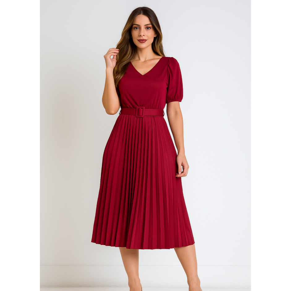 Vestido Feminino Plissado com Manga Bufante e Cinto Brinde Gola V Look Sofisticado e Moderno