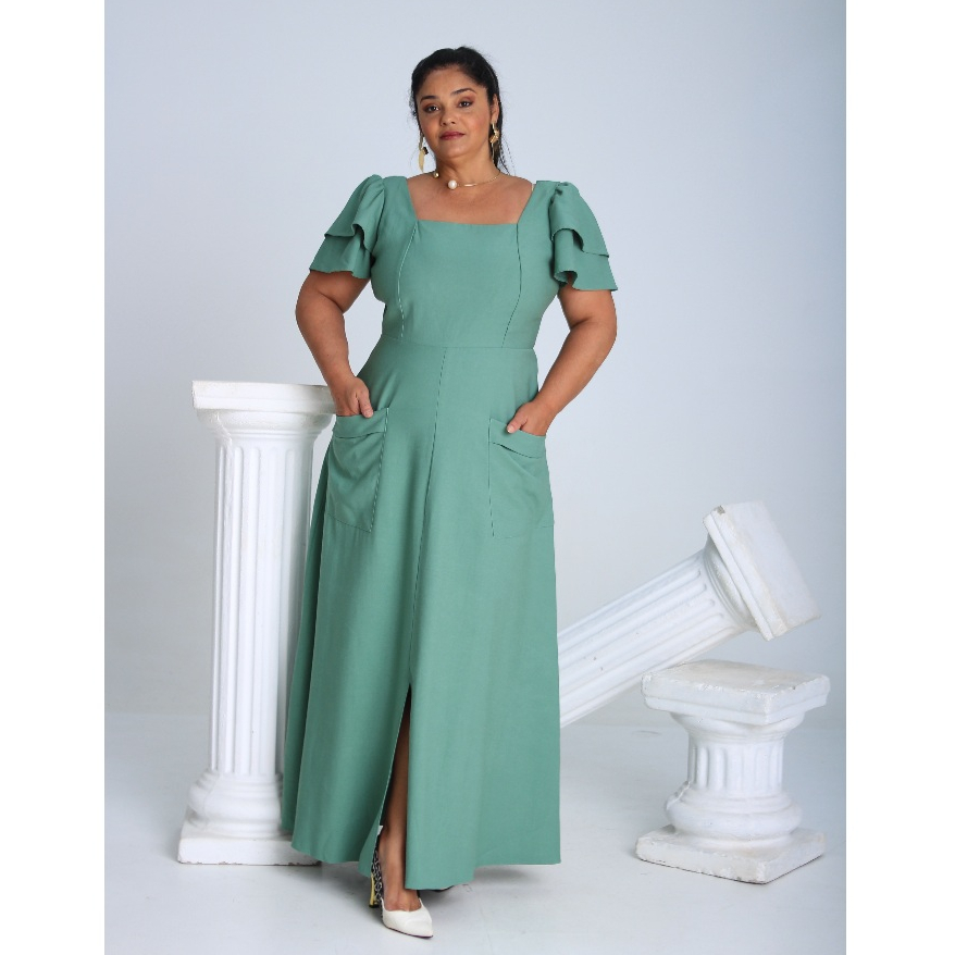 Vestido Feminino Tecido Sensorial com Fenda, Bolsos Frontais e Zíper Nas Costas