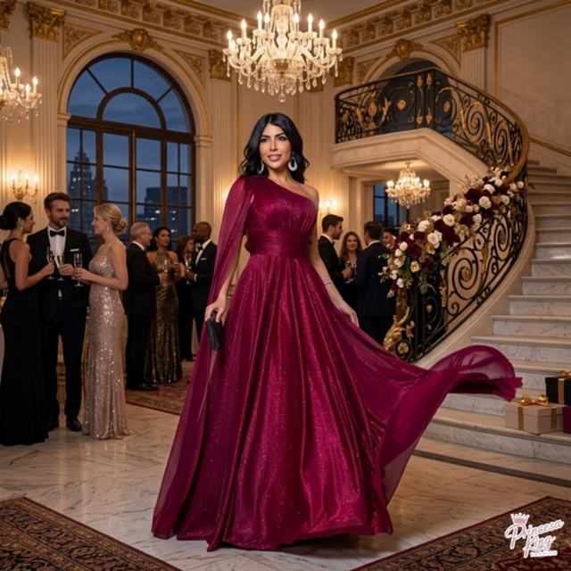 Vestido Feminino Tule Cristal Brilho Longo Bojo Um Ombro Só Manga Capa Longa Moda Baile Festa Social