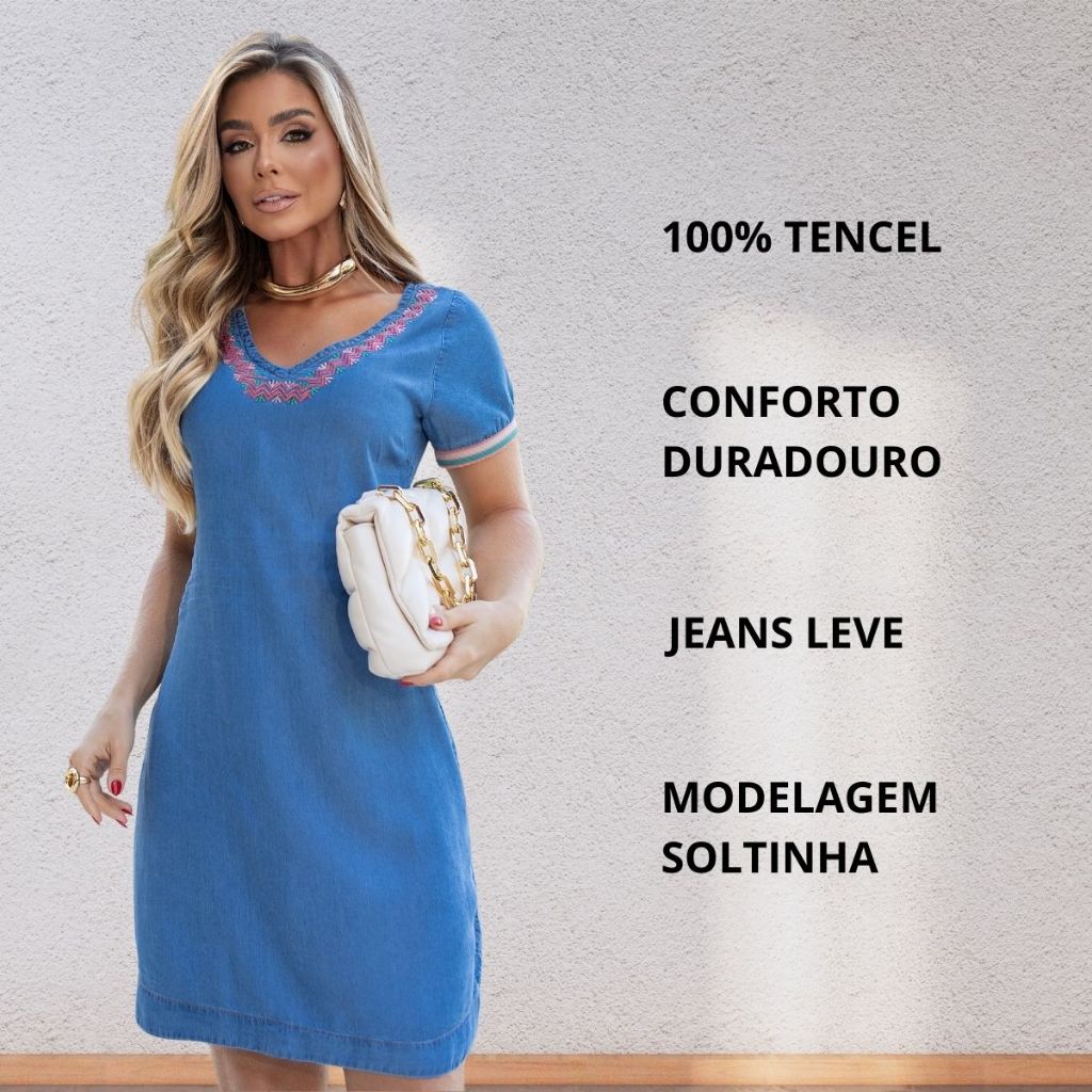 Vestido Feminino Verão Soltinho Jeans Tencel Liocel Decote V com Bordados e Punho