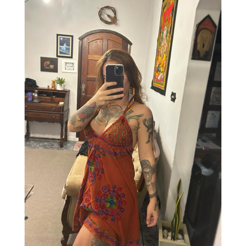 Vestido de origem indiana, seu tecido é estonado, possui lindos detalhes bordados deixando a peça ainda mais graciosa! Costas aberta, tamanho único veste do p ao gg (busto veste até 44) Possui cordinha para regular no pescoço e busto Use de várias formas, como um vestido de alcinha ou como um vestido amarrado no pescoço tecido de qualidade! 🪷