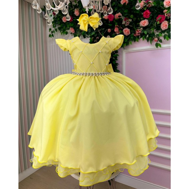 Vestido Infantil Bela e a Fera Temático Amarelo Liso Festa Formatura Luxo