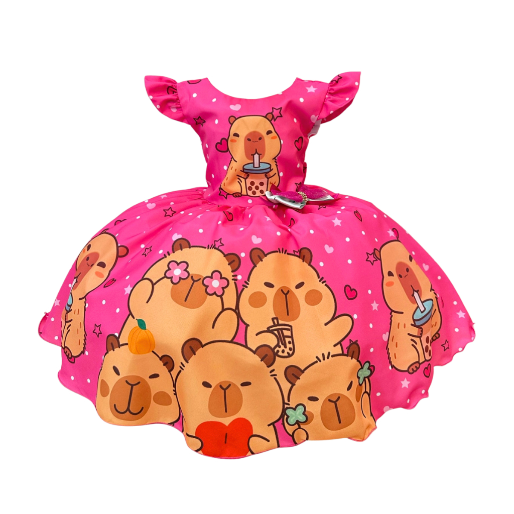 Vestido Infantil Capivara Fofa Rosa Pink Estampado Festa e Passeio 4 a 12 Anos com Laço de Cabelo