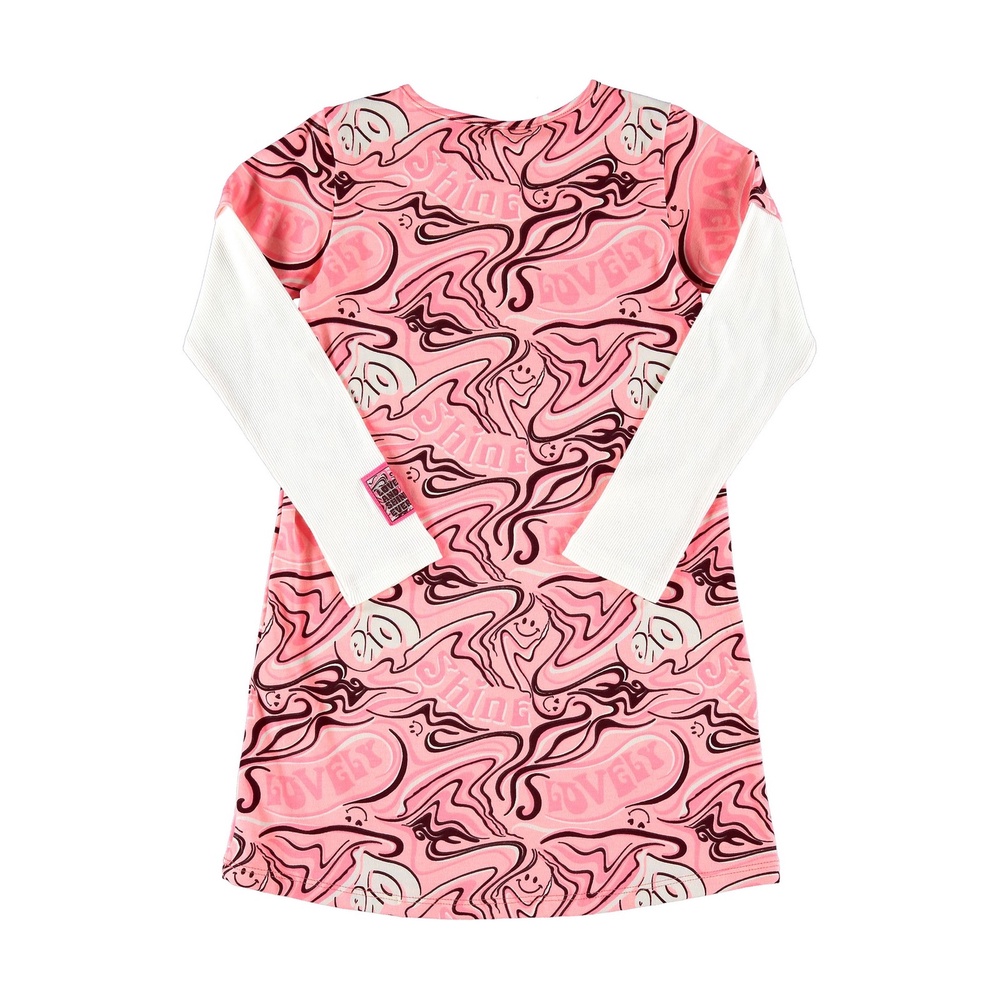 Vestido estampado, confeccionado em cotton com mangas em ribana. O detalhe que imita sobreposição e a etiqueta decorativa na manga são detalhes que deixam a peça ainda mais charmosa. A estampa é super fluída, com fundo rosa neon. Combine com uma meia calça e botinha para um look mais quentinho. Sua pequena vai arrasar!Tecido: CottonComposição: 96%algodão 4%elastanoComprimento: MidiDecote/Gola: RedondoModelagem: AmplaForro: NãoComprimento da Manga: LongaInformações Extras: Estampa, Etiqueta Decorativa e Bainha Sobreposta