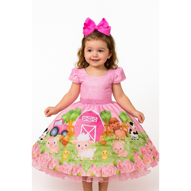 Vestido Infantil da Fazendinha Temático Animais Festa Luxo Rosa Rodado