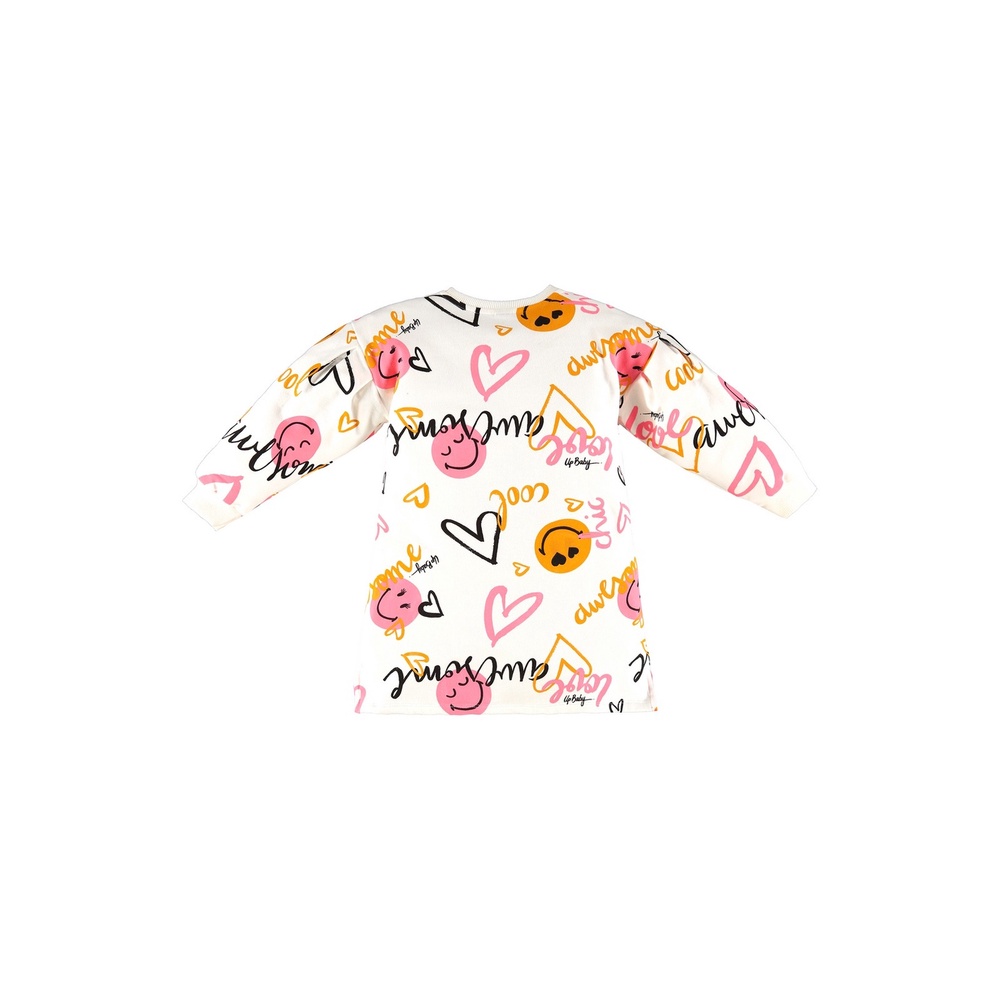 Vestido infantil de manga longa, produzido em molecotton, que garante aquecimento, estilo e conforto para sua pequena. Possui a textura do algodão e do elastano, o que torna a peça macia, confortável e flexível para o uso no dia a dia. O vestido possui estampa de coraçõezinhos, escritos, emojis, gola colocada com filete, punhos e 2 pregas na parte frontal e mais 2 na parte posterior da peça.Tecido: MolecottonComposição: 96%algodão 4%elastanoComprimento: CurtoCintura: MédiaDecote/Gola: RedondoModelagem: AmplaForro: NãoComprimento da Manga: Longa
