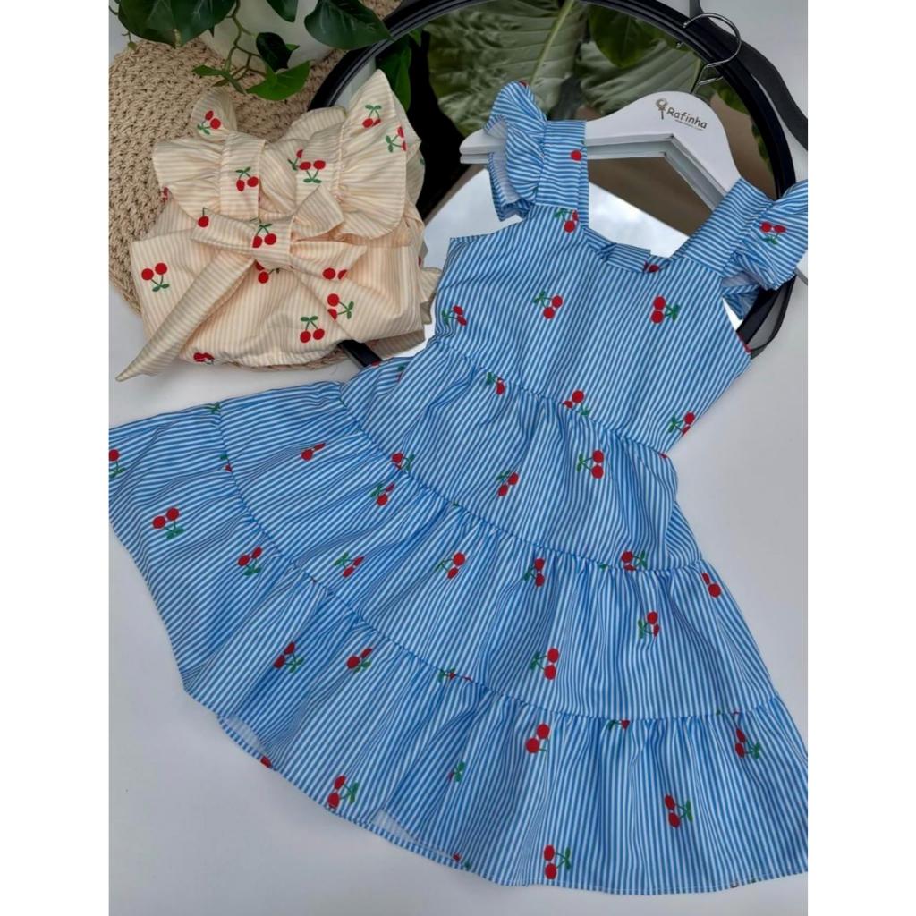 Vestido Infantil Cherry Garden – Charme e Delicadeza Deixe sua pequena brilhar com o nosso Vestido Cherry Garden! Com uma estampa atemporal de cerejas sobre um fundo levemente listrado, este modelo é a escolha ideal para quem busca um visual "romântico-chic" com muito conforto. ✨ Detalhes que Encantam: Design Fluido: Saia em camadas (estilo três-marias) que garante um movimento lindo ao caminhar e rodar. Mangas de Babado: Um toque delicado que traz leveza aos ombros. Estampa Premium: Cerejas vibrantes que se destacam no fundo off-white, criando um contraste alegre e sofisticado. Conforto em Primeiro Lugar: Confeccionado em tecido leve e fresco, ideal para manter a criança confortável durante todo o dia.