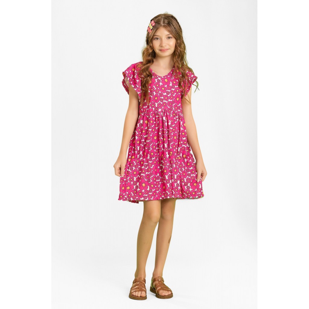 Descrição: Vestido Infantil Feminino Flores Delicadas Vestido em polifléx 96% poliéster e 4% elastano na cor rosa super fofo. Possui estampa rotativa de flores, babados nas mangas e amarração nas costas! Tudo pensado e produzido com muito amor e carinho. Selecionamos os melhores materiais para crianças que desejam ser destaque por onde passam! Guia de Tamanhos Como medir a criança? Utilizando uma fita métrica, envolva as regiões a serem medidas. Busto: Enrole a fita métrica em torno do corpo, na linha do peito. Comprimento: Comece pelo topo do ombro e meça até chegar no comprimento desejado. Quando for calça, short ou saia, comece medindo na linha da cintura. Cintura: Enrole a fita métrica em torno da cintura, sem apertar. As medidas da tabela abaixo são referentes á parte frontal da peça, então busto e cintura você deve multiplicar por 2. A tabela pode sofrer alterações de 1 á 2 cm para mais ou menos, leve isso em conta na hora de selecionar o tamanho adequado. Características: - Tabela de Medidas: Tabela de Medidas Vestido: Tamanho | Busto | Comprimento 2 | 26CM | 52CM 3 | 28CM | 56CM 4 | 30CM | 58CM 6 | 33CM | 61CM 8 | 34CM | 64CM 10 | 37CM | 70CM 12 | 38CM | 73CM - Garantia: 1 Mês - Evento: Não - Tecido Peça: Poliplex - Composição: 96% Poliéster 4% Elastano - Estação: Verão - Faixa Etária: 1 à 12 anos - Gênero: Feminino