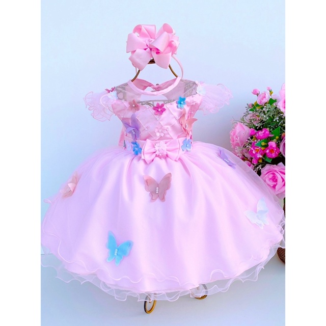 Vestido Infantil Jardim Encantado Borboletas Coloridas Luxo De Festa Tema Chuva de amor e Benção Rosa Floral 1 A 3 Anos