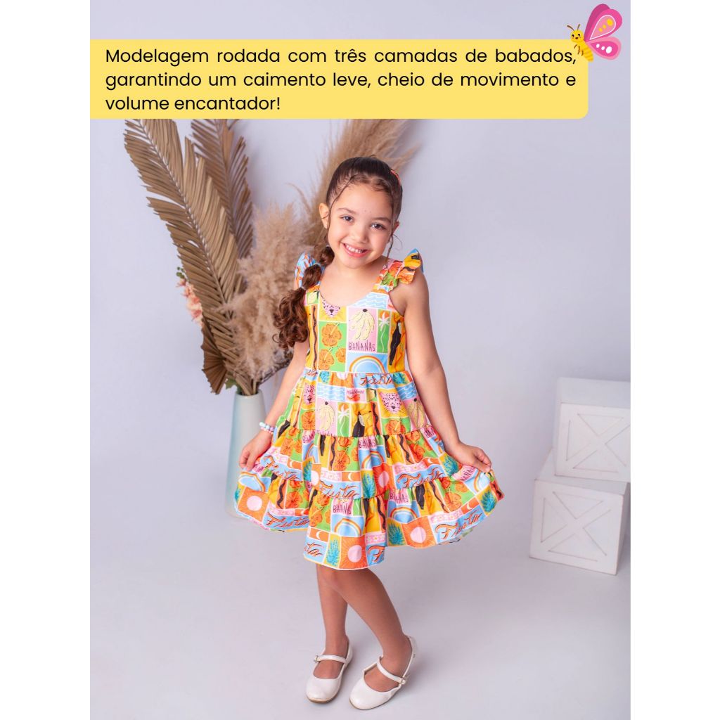 Prepare-se para encantar! Este vestido é uma explosão de alegria, desenhado para acompanhar sua pequena em todos os momentos, do passeio de domingo à festa de aniversário. Ele une o conforto necessário para as brincadeiras com o estilo que a faz brilhar! Destaques da Peça: - Detalhe nas Costas: Decote quadrado aberto com charmosa amarração em laço no topo. Toque de sofisticação e ajuste perfeito ao corpo, valorizando a peça de forma delicada. - Modelagem da Saia: Estilo rodado com três camadas de babados. Movimento e volume irresistíveis! Ideal para girar, dançar e brincar com total liberdade. - Alças com Babado: Alças largas adornadas com babadinhos. Adiciona um toque romântico e delicado, garantindo conforto e sustentação. Por que amamos este vestido? - Vibrante e Divertido: As estampas são o coração do vestido, lindos e com cores vibrantes. - Conforto Garantido: Confeccionado em tecido leve (crepinho), proporcionando frescor e ótimo caimento. - Versatilidade: Perfeito para festas temáticas, celebrações de verão, encontros em família ou para um dia cheio de brincadeiras.