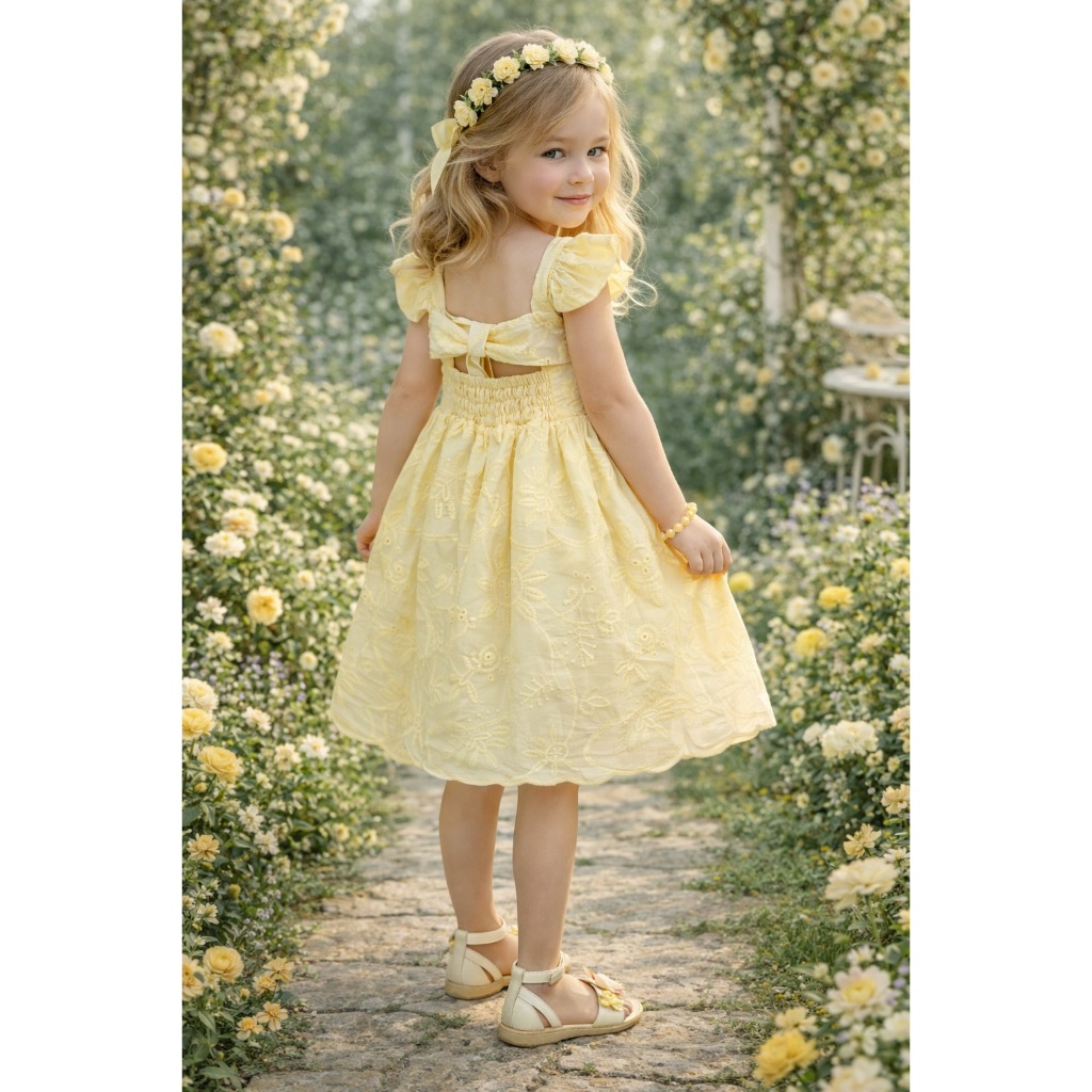 Vestido Infantil Laise Broderie Amarelo Bebê Babados e Ajustes Costas