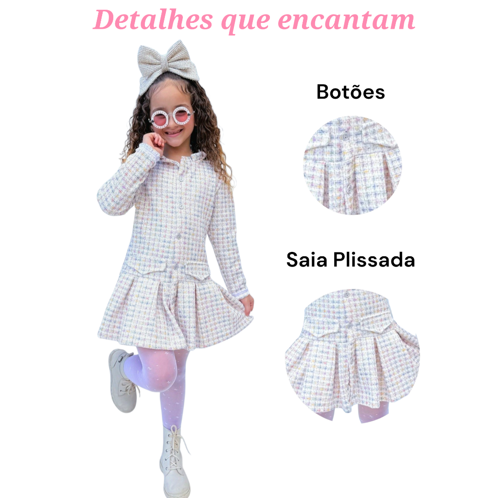 Bem Vindo a Grife Bela Kids! -------- 🛍️Envio imediato! Comprando até ás 15 horas, enviamos no mesmo dia útil ! -------- 💕Deixe sua pequena ainda mais linda, Estilosa e Confortável nesse Outono Inverno com este Lindo Vestido Infantil Feminino Manga Longa Soft Tweed Menina Blogueirinha Fashion! Perfeito para meninas que amam se vestir bem, brincar com liberdade e arrasar em qualquer ocasião, Ideal para Looks Aniversário, Casamentos, Fotos Encantadoras, Festas, e Momentos Especiais. Ideal para sua filha ou dar de presente! Detalhes do Vestido : • 🩷Vestido em tecido Soft Tweed Premium – Rico em detalhes com fios entrelaçados que garantem elegância, corte acinturado com saia levemente plissada, botões decorativos que trazem um ar de Boutique, dando um charme no Look Fashion. Acabamento impecável e costura reforçada, garantindo durabilidade mesmo após várias lavagens. ✨ Por que as mamães amam esse Vestido? ✔️ Super confortável — Looks Aniversário, Casamentos, Fotos Encantadoras, Festas, e Momentos Especiais. Ideal para sua filha ou dar de presente. ✔️Estilo moderno e delicado — combina com tênis, sandálias, botas e acessórios; ✔️Tecido leve e quentinho — perfeito para o Outono e Inverno ✔️Ótima qualidade com preço acessível! Tamanhos disponíveis: 2, 4, 6, 8, 10 anos (consulte a tabela de medidas antes da compra) 🛍️ Garanta já o seu! Adicione ao carrinho e surpreenda sua pequena com um look Sofisticado cheio de charme, estilo e conforto! Qualquer dúvida estamos a disposição no chat!