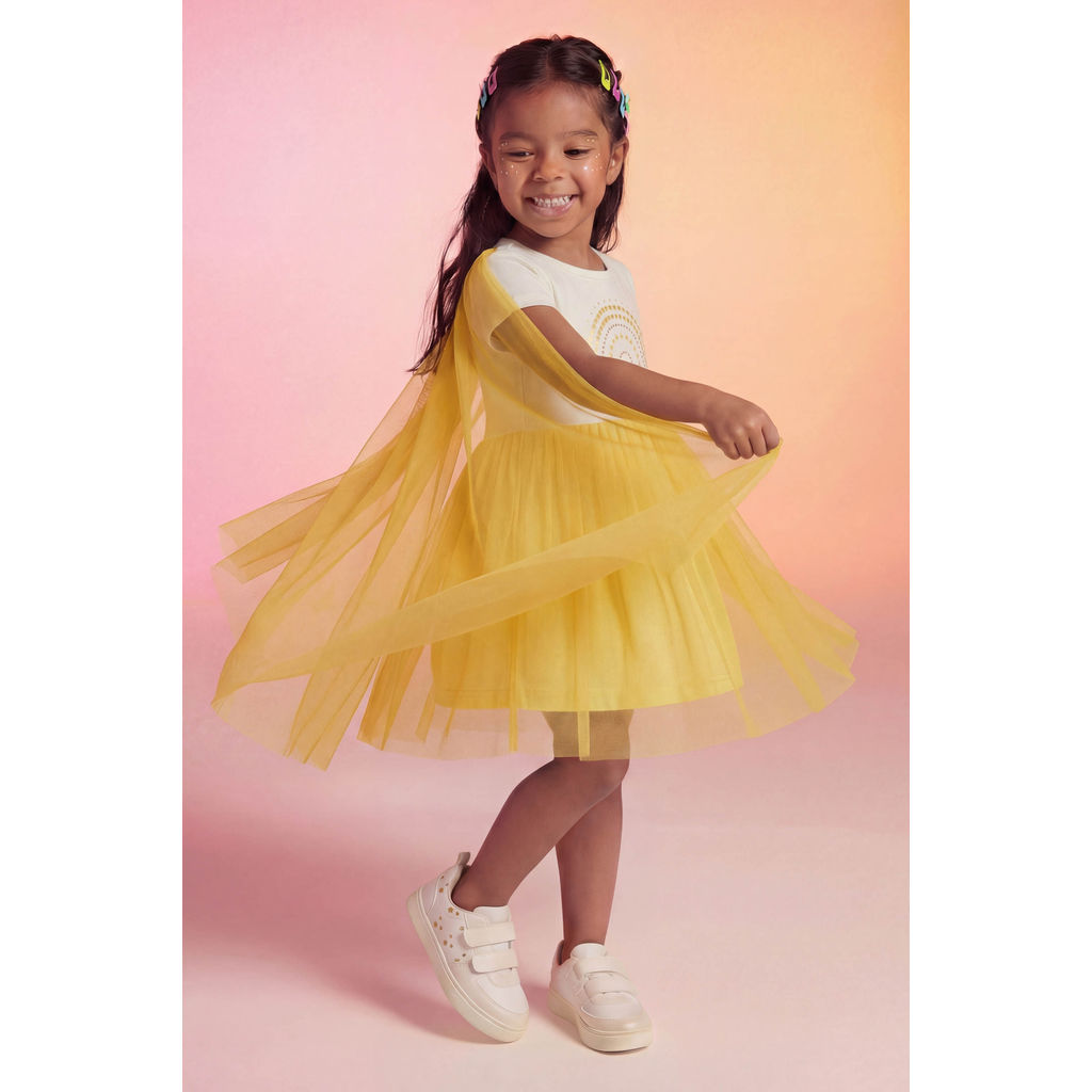 Ideal para as meninas que querem voar alto, o Vestido Elian promete um visual encantador e divertido! Feito em meia malha e tule, ele possui mangas curtas e elástico franzido na cintura, oferecendo uma modelagem mais soltinha. Sua estampa frontal delicada de arco-íris traz detalhes em glitter e strass, enquanto o destaque fica por conta da sua capa em tule, que imita asas e deixa o look ainda mais incrível. Perfeito para momentos mágicos e alegres, invista nesse vestido cheio de criatividade!Modelo gerado por IA para fins ilustrativos. Em caso de dúvidas, considere a foto oficial sem modelo.Detalhes da peça: • Feito em meia malha e tule • Possui mangas curtas • Possui estampa de arco-íris • Possui detalhes em glitter e strass • Possui capa em tule imitando asas • Ideal para momentos mágicos e festas a fantasia