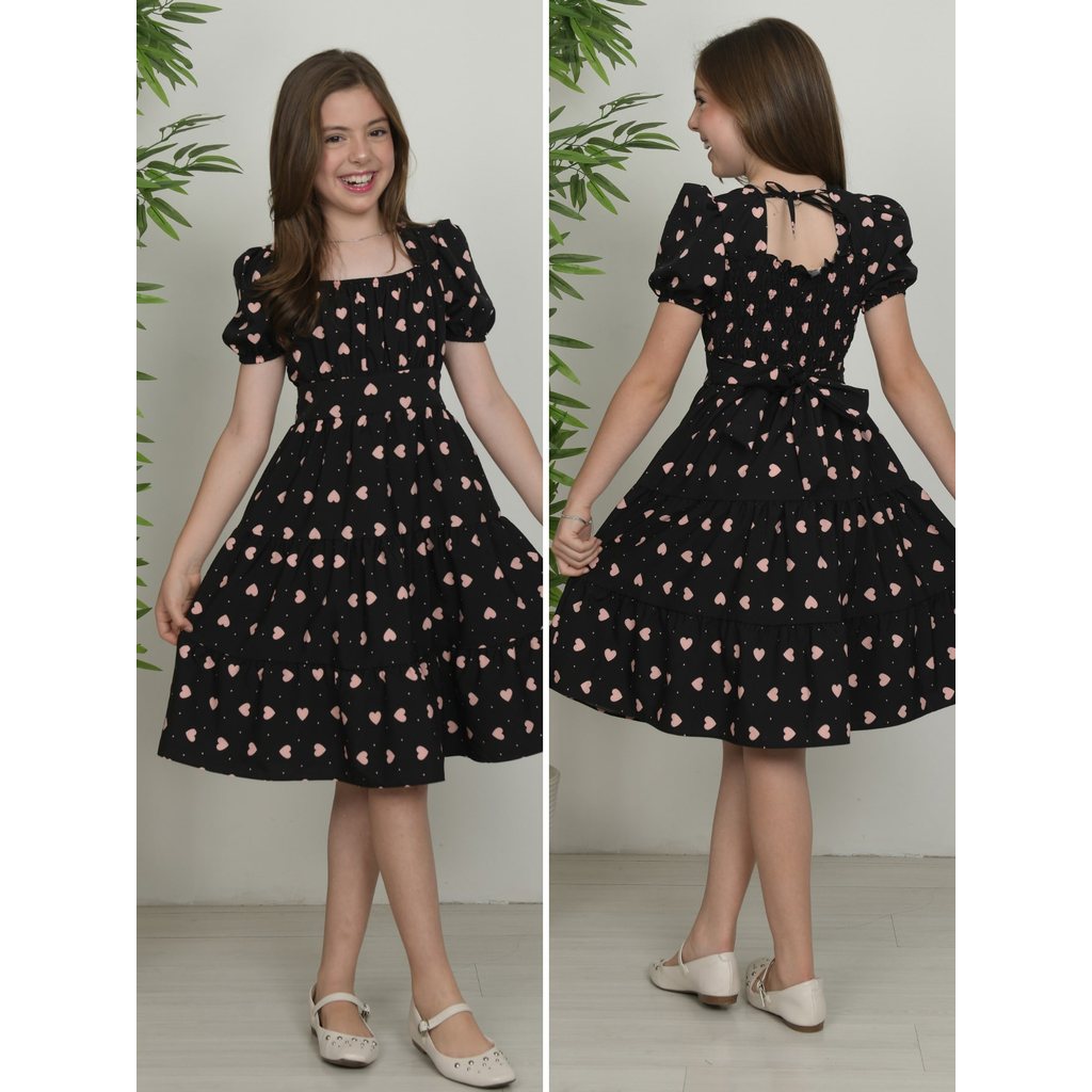 Vestido Infantil Midi Estampa Coração Laço nas Costas Manga Princesa Tamanhos 10 ao 16 Moda Juvenil