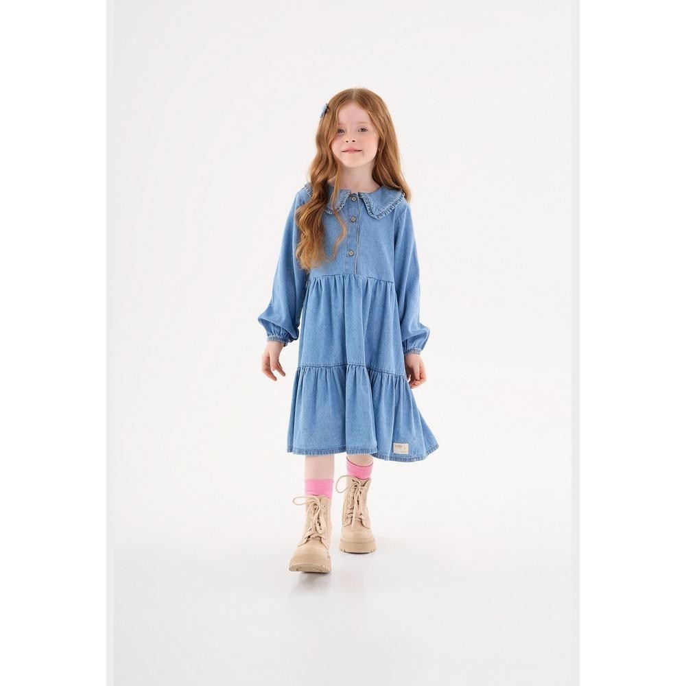 Vestido infantil confeccionado em jeans, peça encantadora que combina estilo e fofura. Possui gola delicadamente adornada por babado, abertura com botões na parte frontal, facilitando na hora vestir e proporcionando praticidade. As mangas bufantes adicionam um charme adicional à peça, efeito de lavanderia em todo o vestido, enquanto os recortes proporcionam um franzido gracioso.Tecido: JeansComposição: 100% AlgodãoModelagem: AmplaComprimento Manga: LongaModelo Manga: BufanteComprimento: CurtoForro: NãoCintura: Média