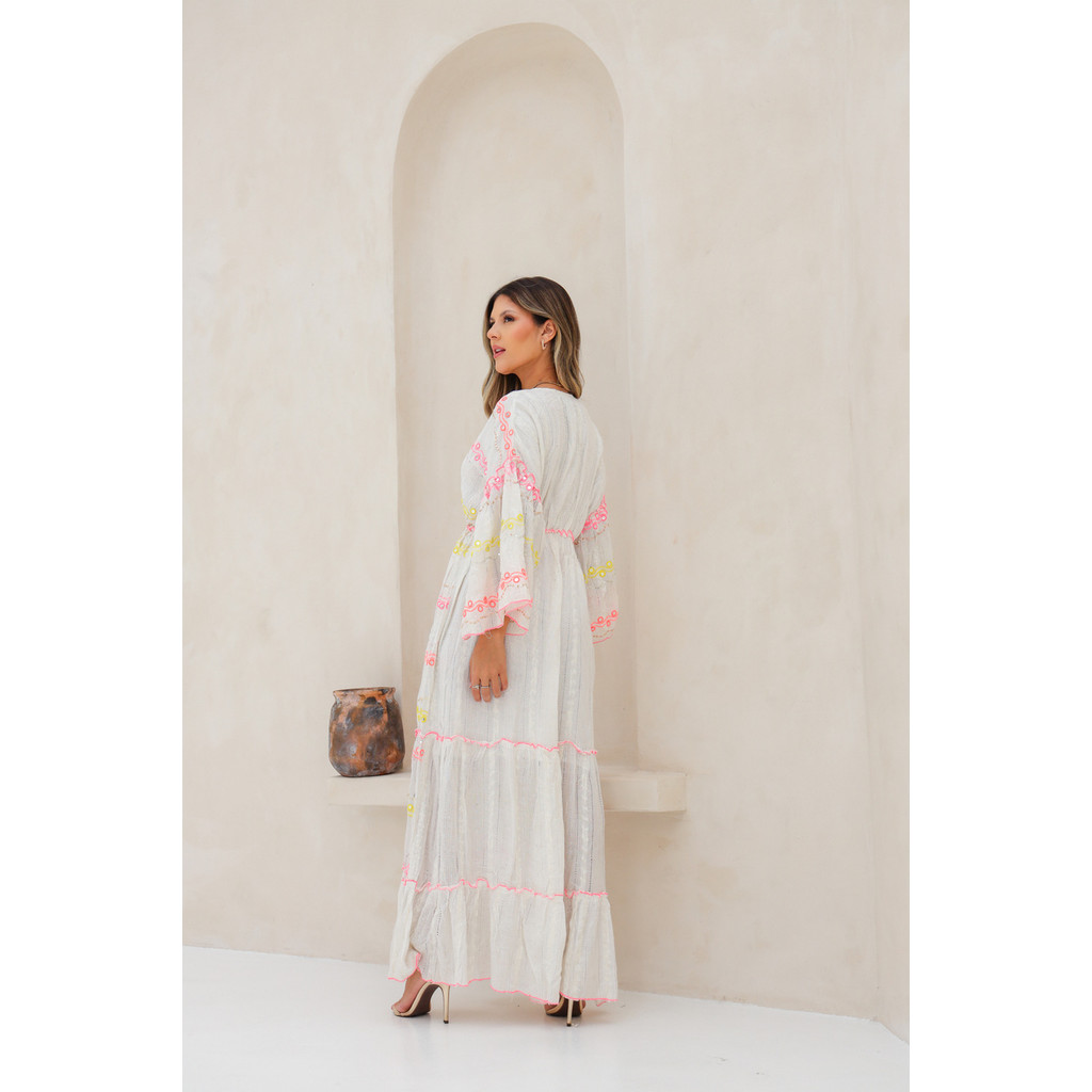 Vestido Longo Boho Bordado Com Manga Flare 5061