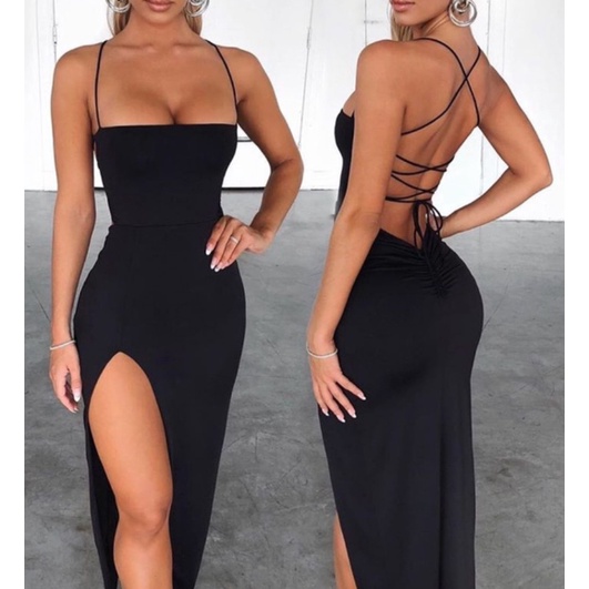 Vestido Longo Com Fenda Abertura Lateral Costas Trançadas Amarração Tubinho Suplex Feminino Natal Ano Novo Festa Virada