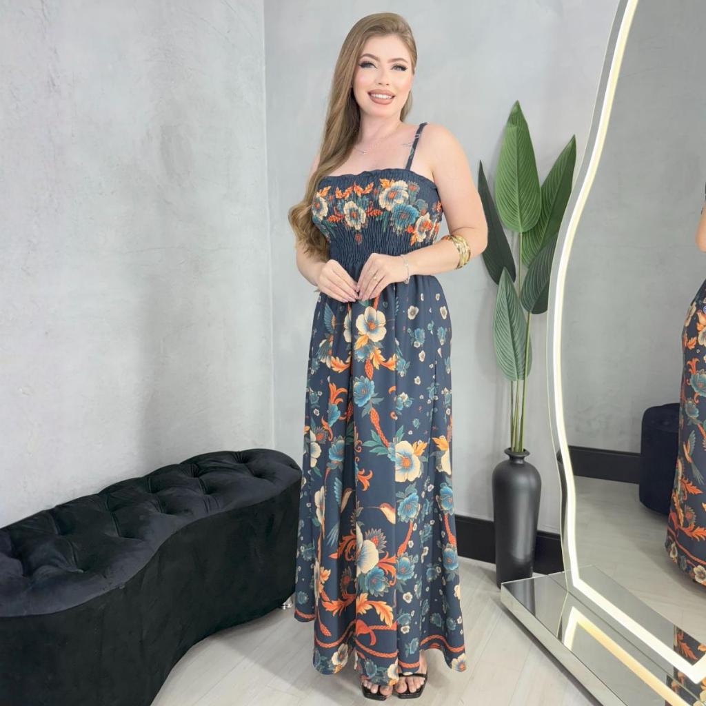 Vestido longo estampado, ideal para quem busca praticidade e conforto. Confeccionado em Crepe Santorine, um tecido fresquinho que se destaca por NÃO amarrotar e NÃO encolher. O modelo possui estampa tropical localizada (frente e costas), alcinhas com regulagem para ajuste ideal e lastex no busto, que permite que a peça estique bastante, vestindo com conforto. Grade de Tamanhos: P: Veste 36/38 M: Veste 40/42 G: Veste 44 Medidas e Referência: Comprimento total: 1,45 m (medido das alças até o final do vestido). Para referência: A modelo da foto possui 1,70m de altura. Observação: As estampas são exclusivas da marca. Selecione a estampa desejada entre as variações disponíveis no momento da compra.