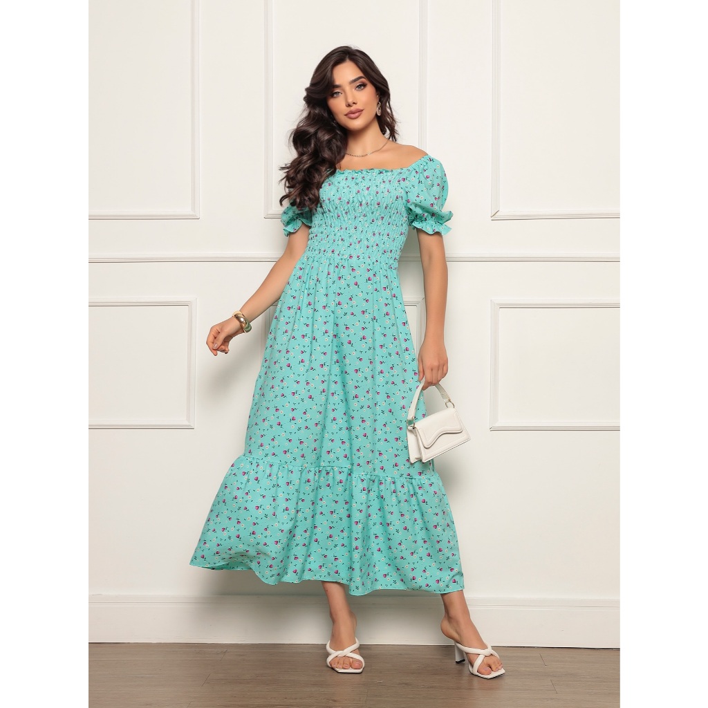 Vestido Longo elastex Feminino Manga curto estampado floral