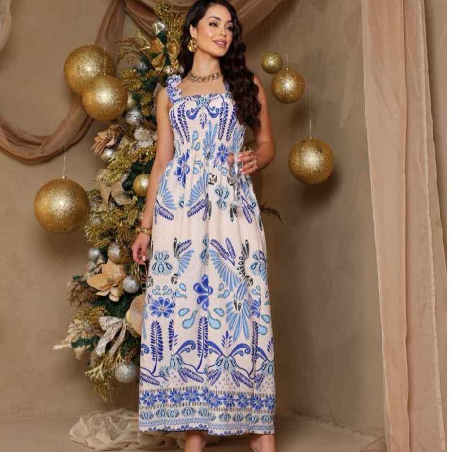 Um vestido que une a elegância clássica da estampa de porcelana com a leveza e o conforto ideais para os dias de verão, festas e ocasiões especiais! O Vestido Longo Estampa Porcelana é uma peça sofisticada e cheia de charme. Estampa Exclusiva: Padrão floral e ornamental em azul royal sobre fundo branco, remetendo às belíssimas louças portuguesas e orientais, garantindo um visual luxuoso e atemporal. Modelagem Longa e Fluida: O comprimento maxi proporciona um caimento impecável e muito movimento, alongando a silhueta. Detalhes que Valorizam: Possui decote reto com franzido (ou lastex na parte superior, se tiver), alças largas com detalhe charmoso (como um leve babado)e elástico/lastex na parte frente e trás da cintura para ajuste perfeito e máximo conforto. Ocasiões: Perfeito para casamentos (convidada), formaturas, eventos diurnos, festas de final de ano, viagens e passeios sofisticados. Tecido: Leve, fresco , crepinho . Cores: Azul Royal e Branco Tamanho: ( Tamanho Único 38 /44) MEDIDAS BUSTO 100 CINTURA 95 QUADRIL 110 Estilo: Longo, Elegante, Estampado Decote: (Descreva: reto, quadrado, coração, etc.) Alças: (Largas, com babado, .) Cintura: Lastex na parte n frente trás para melhor ajuste. Tecido: ( crepinho )