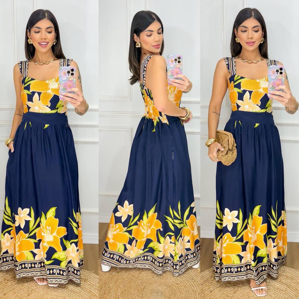 .Vestido Longo Feminino Estampa Floral Viscolinho Este é o vestido que une conforto, estilo e versatilidade para o seu dia a dia! Feito em tecido viscolinho leve e de alta qualidade, este vestido longo tem um caimento impecável que valoriza a silhueta sem apertar. A estampa floral exclusiva traz um toque de elegância e frescor, ideal para qualquer ocasião casual, seja um passeio no shopping, um almoço com as amigas ou um evento ao ar livre. O design com manga regata e decote V é clássico e confortá O grande destaque fica por conta dos detalhes: um charmoso laço frontal que adiciona um toque delicado e o elastex nas costas que molda o corpo de forma suave e garante o ajuste perfeito. Por que este vestido é a escolha certa para você? Tecido: Viscolinho de boa qualidade, é super agradável na pele. Caimento Perfeito: O elastex nas costas e o tecido fluido se adaptam a diferentes tipos de corpo.con bolso lateral imbisible Versátil e Moderno: Combine com sandálias para um look leve de verão ou com tênis para um visual mais despojado. Garanta já o seu e sinta-se linda e confiante em todos os momentos!