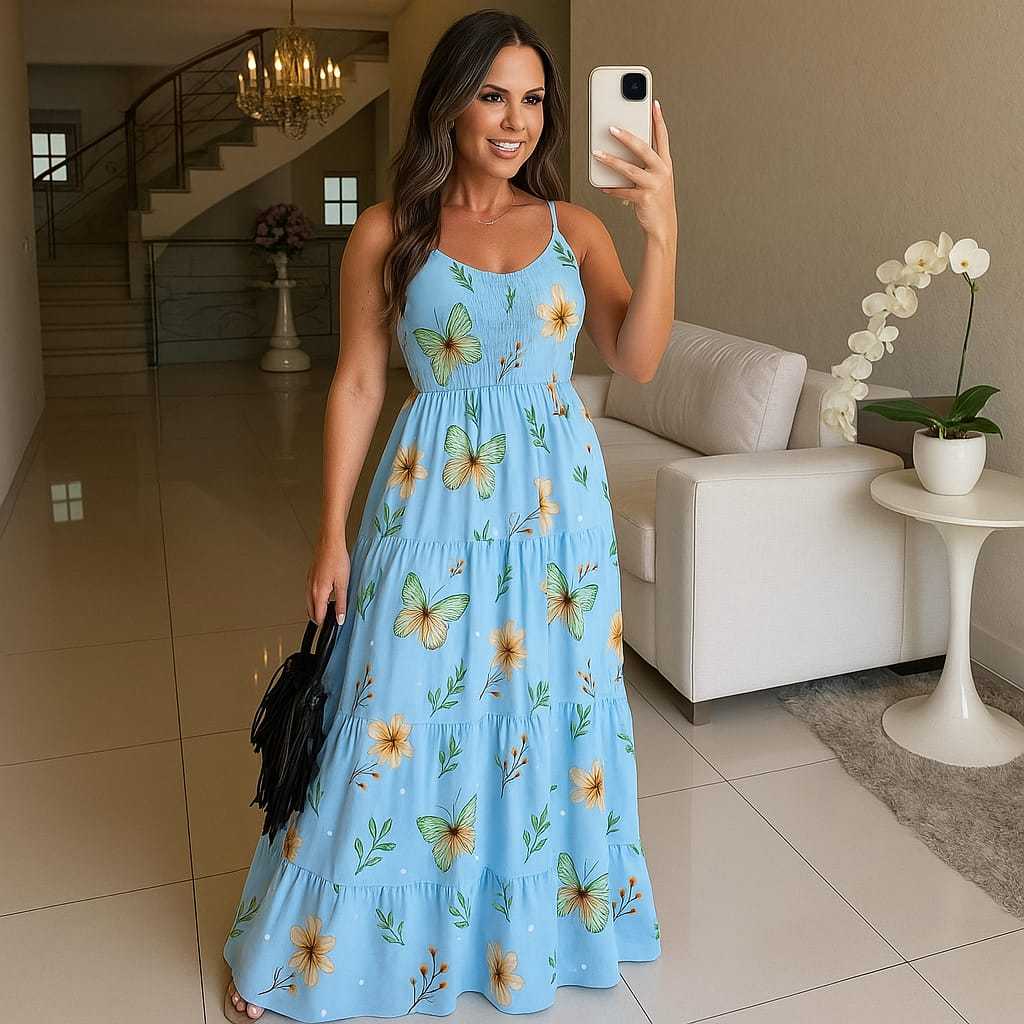 👗Vestido Longo Feminino Borboletas com Alça Regulável, Lastex e Bojo Este vestido longo combina sofisticação e delicadeza, com um encantador decote em V que realça a feminilidade. Sua estampa de borboletas, sobre o suave e leve tecido de viscolinho, traz um toque de elegância e frescor ao visual. O bojo integrado proporciona suporte e valoriza o busto, enquanto as alças reguláveis garantem um ajuste perfeito. Ideal para ocasiões especiais, este vestido adiciona um toque único de sofisticação ao seu guarda-roupa. Características: - Tecido Viscolinho, leve e confortável. - Bojo e forro integrados para maior suporte e acabamento. - Alças reguláveis para um ajuste personalizado. - Veste até o tamanho 44, adaptando-se perfeitamente ao seu corpo. - Comprimento 144 cm
