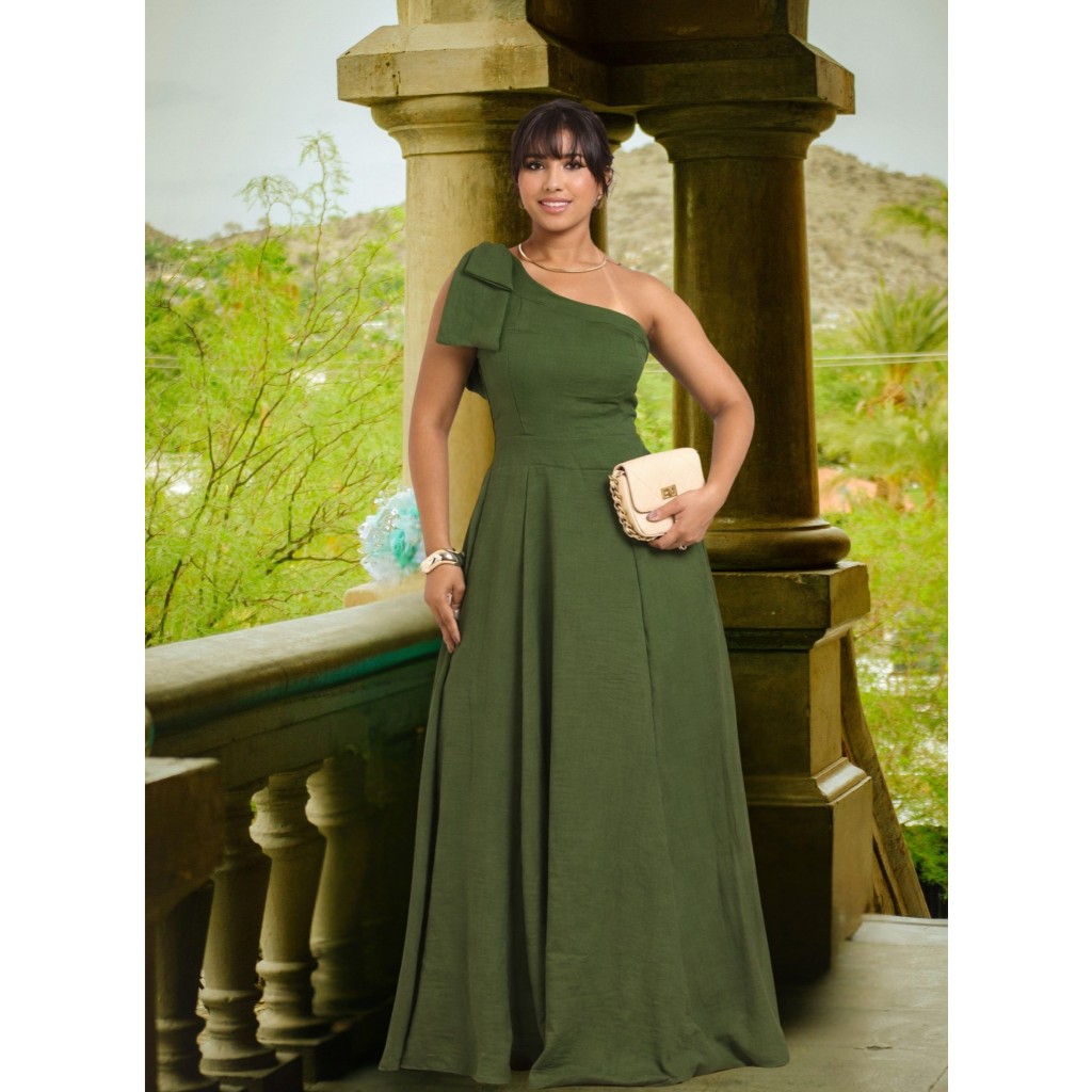 Vestido Longo Feminino Duna Linho Ombro Único Elegante para Festa