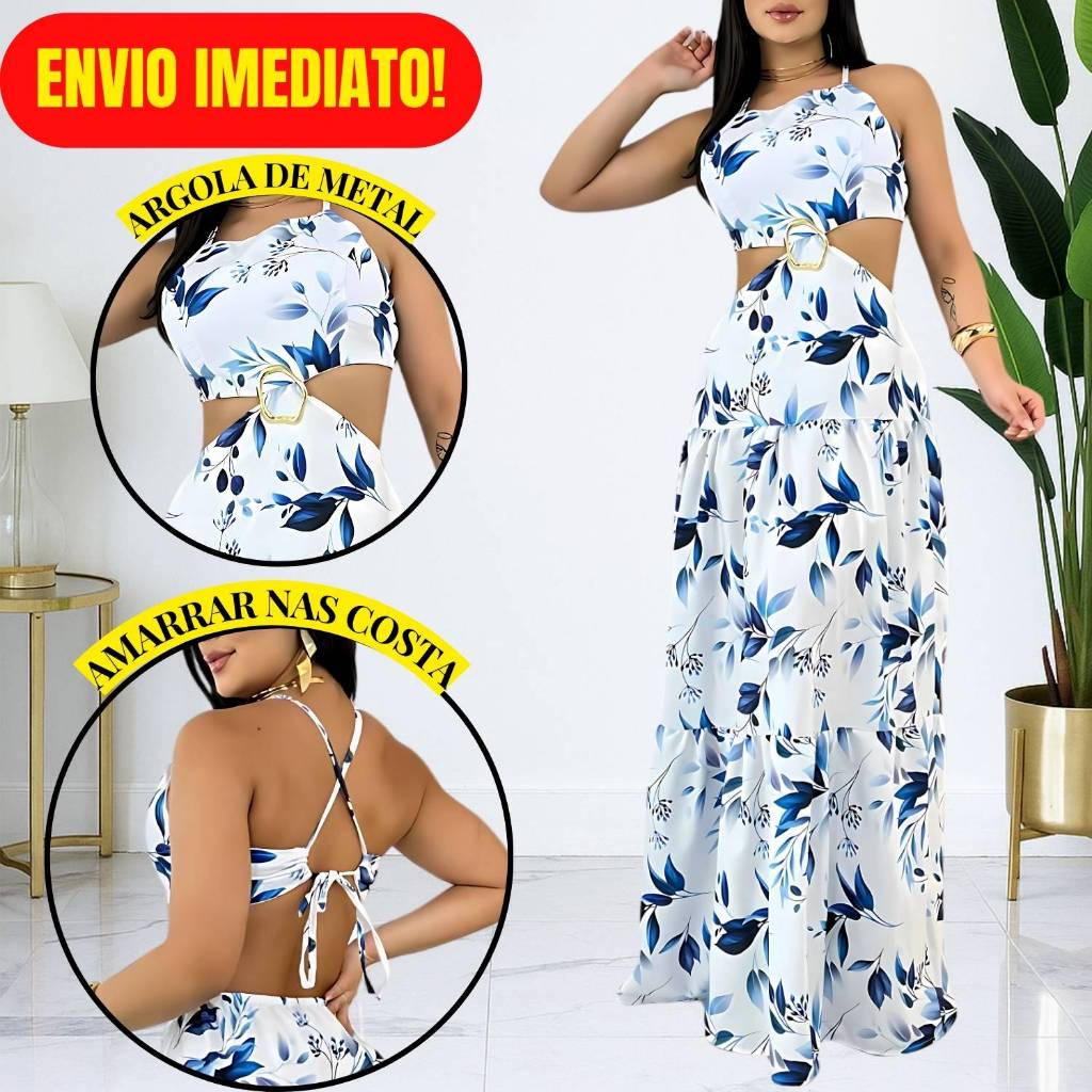 Vestido Longo Feminino Estampado Floral Verão Alcinhas Finas Rodado Tecido Cedinha ELEGANTE